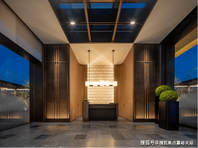 例如,在归家的动线上,保利以古代“提灯夜游”为灵感,将“灯”这一意向穿插其中——在公区入户大堂内,造型别致的壁灯格外惹眼,其灵感来自于“中国古典豆形灯”;落壁灯则是以古铜不锈钢搭配仿透光云石灯具,营造出朦胧的光晕氛围,颇具东方意蕴。