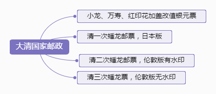 从1878年发行第一套大龙邮票到1911年辛亥革命推翻了清王朝,这段清朝末期发行的邮票是中国早期邮票。清代邮票在设计风格上力求体现中国文化特色,邮票发行种类有普通邮票、纪念邮票、欠资邮票、快信邮票及限西藏贴用邮票。又分为两个阶段。