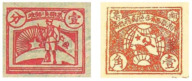 中国在土地革命战争时期先后创建了十几个红色根据地, 为适应战时通信需要,在各革命根据地建立赤色邮政,发行了赤色邮政邮票。赣西南赤色邮政在1930年5-6月间发行的第一套邮票,是中国解放区发行最早的邮票。土地革命战争时期,11个苏区13个邮政机构共发行邮票13套34枚。