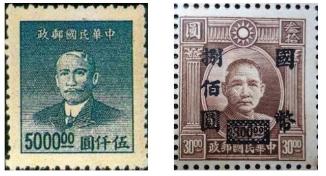 抗日战争胜利后, 统治区经济崩溃,物价飞涨,币值频变,形成邮资无定的局面。1945年9月后出现了加盖繁杂的“国币”邮票。1948年10月后又发行 “金圆”邮票。邮票面值越来越高国币邮票和金圆邮票面值高达500万元,包裹邮票最高为1000万元。4年时间发行各类邮票达54套,其中普票26套,纪念邮票12套,单位和包裹邮票各4套,航空和欠资邮票各3套,特种和附捐邮票各1套。