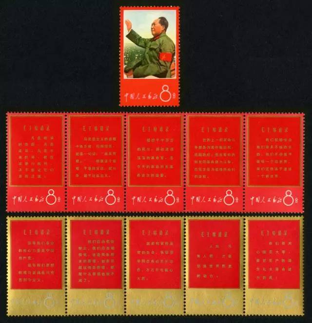 文字邮票的特点是:1.多为大型票幅。2.大红刷色为主。3.语录诗词文字邮票多,头像多。4.政治色彩极浓。5.票名标语口号化。6.面值多为8分平信资费。7.邮票铭记改用手书体。